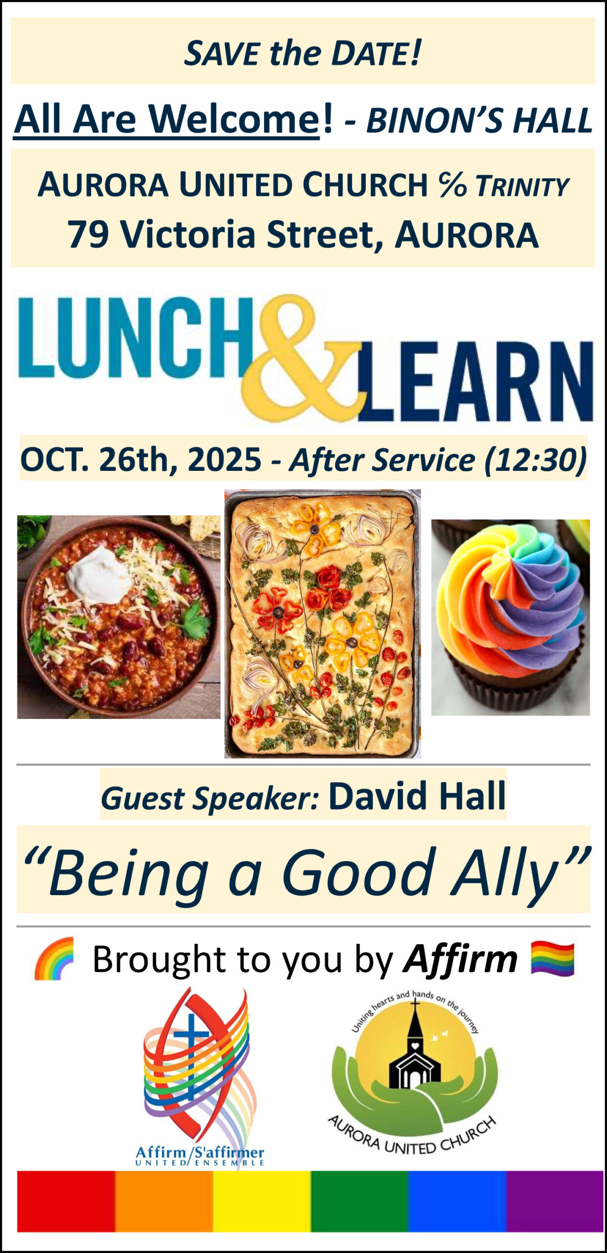 This event is sponsored by Aurora United Church's Affirming Ministry. The event will include a luncheon followed by a presentation by guest speaker David Hall on "Being a Good Ally". Come for some good food, fellowship and learning. Please let us know if you are coming by sending a quick email to Affirming Committee Co-Chair Lisa Kyriakides at lisa@kyriakides.ca